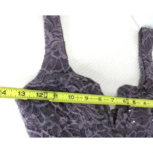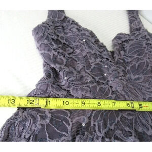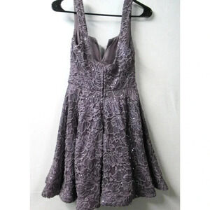 This fun and flirty mini dress from Xtraordinary is perfect for almost any dressy occasion. In a beautiful dusty purple color, all over floral lace and sequins and a slight flair at the hem. Sleeveless with a sweetheart v-neckline. Junior size 1. Perfect for a prom, school dance or any other festive occasion.