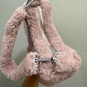 Only one available. Handmade from dyed genuine shearling leather, has a beautiful fleece texture. Includes real rabbit fur balls charm. Spacious enough for your phone, wallet, cosmetics, compact umbrella, book, and other items.