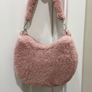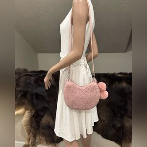 Dusty Rose Real Shearling Leather Half Moon Handbag with 2 Straps & Fur Charm
