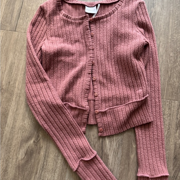 Chic ribbed cardigan in a dusty rose hue. Features button-up front and long sleeves. Ideal for layering.