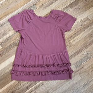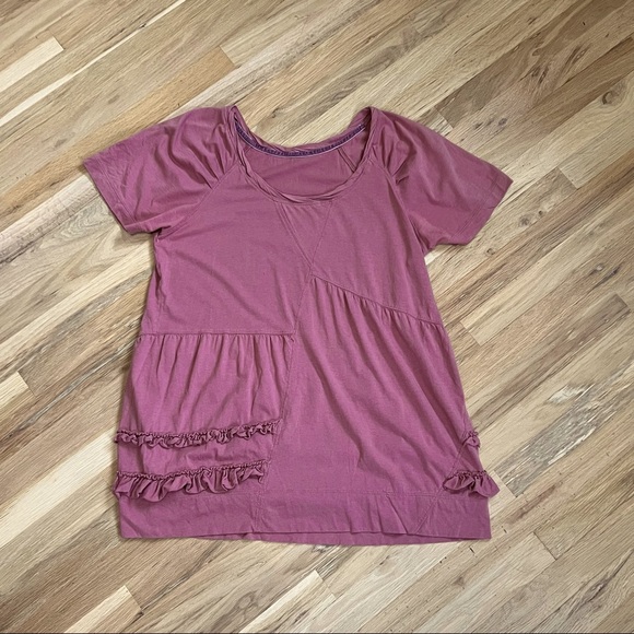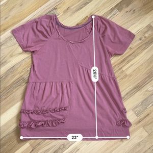 Sweet dusty rose ruffle tee. No tag to scratch your neck or side, with a velvet ribbon on the back neck. Fits like a medium, has Sundance vibes. Measurements are approximate.