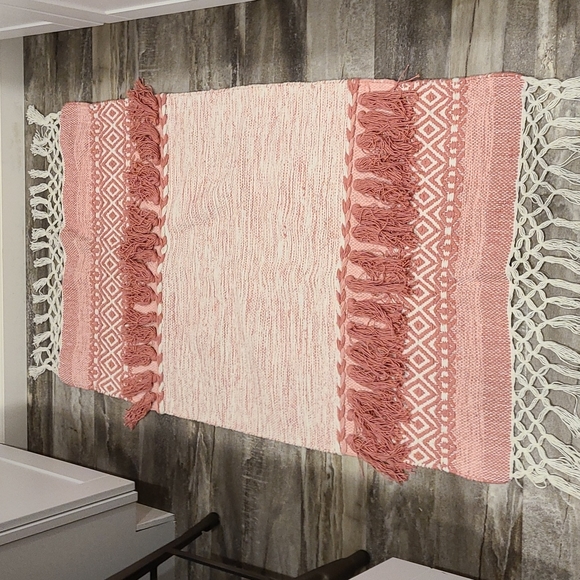 This fabulous rug is a dust rose/coral and is in good, used condition. Approximate size is 27x46".