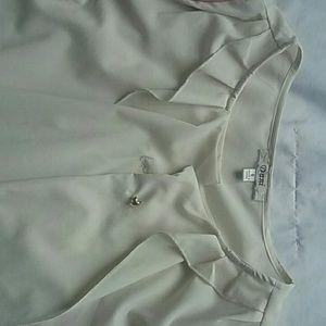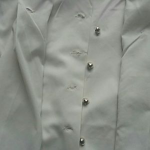 One of the most unique items of clothing I have ever owned. It is cream satin bodice with dusty rose sleeves. The buttons are silver and there are ruffled along the neckline as well fashionable front folds.