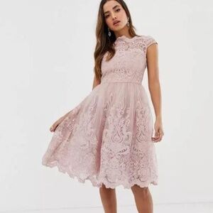 Dusky pink/mink lace dress with a very flattering neckline. Never worn, tags still on. Can be worn as is for a romantic look to a prom or wedding. Or anyone with some tailoring skills could remove the net under for a more sleek look.