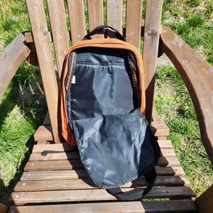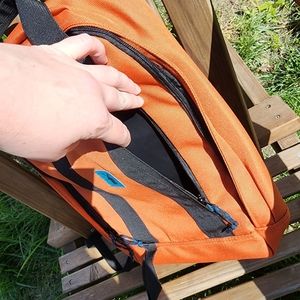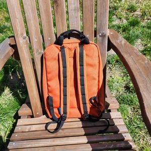 Laptop pocket with keyring loop, front zipper pocket, utility straps along the shoulder straps, and a loop on the front bottom left I'm assuming to attach a water bottle.
