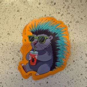 Fun porcupine sticker featuring sunglasses and a drink. Bright orange and teal colors. Dutch Bros Sticker Limited Edition Dutch Fan Made Sticker 6/04