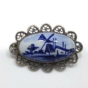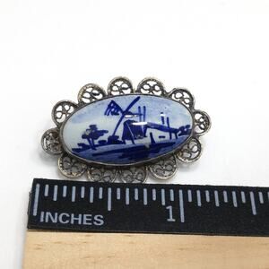 Dutch Delft 835 Silver Filigree Brooch, Windmill Porcelain Pin, 1940s Vintage