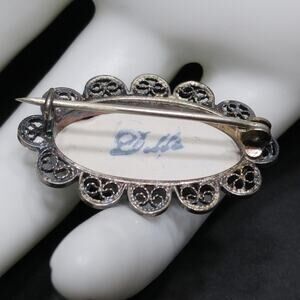 *Description: This is a great Dutch DELFT windmill brooch in 835 silver in a filigree frame with a very long pin in a c clasp from the 1940s. I left the silver filigree pin with its natural silver patina. You may want to clean it with a silver polishing cloth or leave as is. This would be a great addition to your vintage jewelry collection or make a great vintage gift!