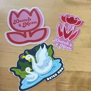 Set of three Dutch Mom stickers featuring floral and swan designs. Vibrant pink and blue colors.