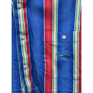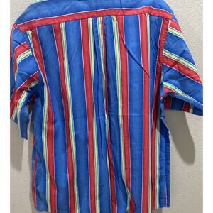 The Duxbak Men’s XL Stripped Vintage Shirt is a stylish retro, 90’s style colorful stripped dress shirt. Made from cotton with a relaxed fit, this collared dress shirt features a button-down closure and short sleeves. The multi-colored stripes in a 90's style add a retro touch to the oversized shirt, making it perfect for casual or dressier occasions. With its easy care fabric and convenient pockets, this vintage shirt from Duxbak is a versatile and timeless piece.