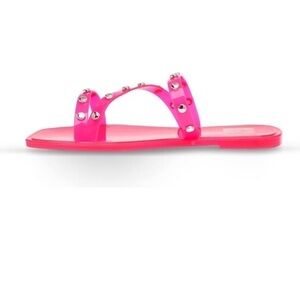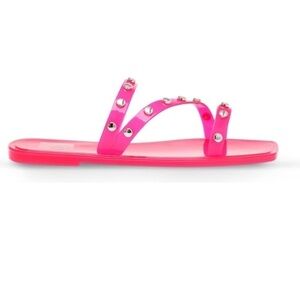 Slender straps are accented with metallic studs for an edgy jelly sandal that’s ready to conquer summer looks.