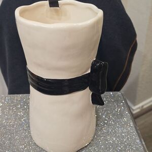Elegant white vase featuring a glossy black bow accent. Perfect for home decor.