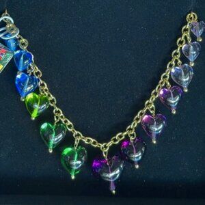 Gorgeous Gold Tone Necklace with 13 Murano Glass Hearts, ranging in size and in a multicolor ombre.
