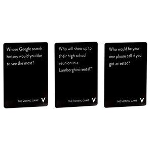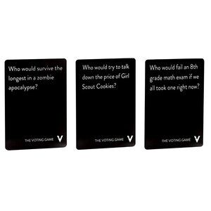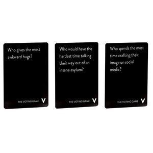 The Voting Game is a group card game that uncovers the sometimes disturbing, but always hilarious truths behind your friendships. The Adult Party Game About Your Friends. The fun begins with the first question is revealed, Example Question Cards: "Who are you most afraid of?", "Who would have the hardest time talking their way out of an insane asylum?", "Who will be the hardest to recognize in 10 years?", "Who would survive the longest in a zombie apocalypse?" Players of this card game for adults then vote anonymously for the player that is best described by the question. Results are tallied and revealed to the group- laughter is guaranteed in this fun adult game for game night! Each player guesses who voted for them. Players get one guess for every vote they receive. If they guess correctly the truth is revealed in this adult board game.