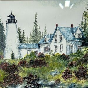 ~Style: art print, framed, Maine, 1993, 90s, lighthouse, cottage, woodsy