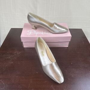 Step into elegance with these vintage Dyeables Romantic Formal Wedding Shoes in Champagne. With a closed toe and slip-on closure, these pumps feature a mid-height heel of 2-2.9 inches, perfect for any formal occasion. The solid pattern and MAN MADE upper material add to the sophistication of these shoes. These heels are perfect for any woman looking to add a touch of glamour to her formal attire. The 80s and 90s theme of these shoes make them a unique and fun addition to any wardrobe. Don't miss out on the chance to own these stunning Dyeables pumps.