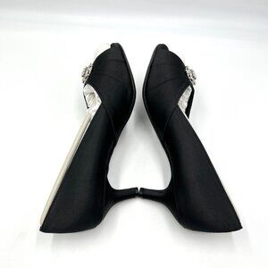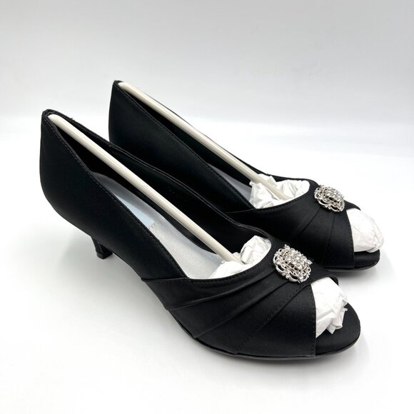 Dyeables women's Kristin black satin jeweled open peep toe kitten heels.