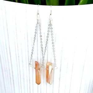 Silver ear wire hooks accented stainless steel chain & dyed orange quartz crystal points