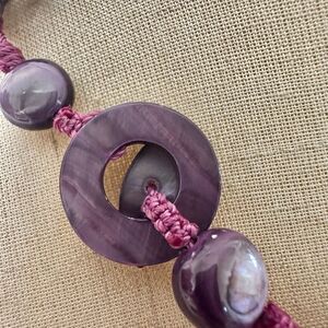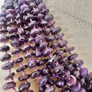 Stunning and bold, this necklace features multiple cascading strands of dyed purple abalone shell beads, knotted on purple cord and finished with an iridescent shell button clasp. The beads shimmer between violet and plum tones, giving it a rich and dimensional look. A true statement piece that’s both boho and elegant.