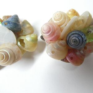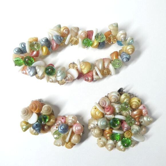 Vintage costume jewelry set consisting of a pendant, clip on earrings, and matching elastic bracelet. All are made of seashells, with multicolored dyed pieces. Good shape overall with some surface wear from handling.