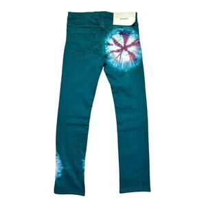 A turquoise denim with absolutely beautifully colored dyed effect blotching tastefully throughout. A standard straight leg fit.