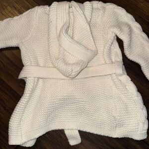 Elegant cream knit cardigan with a cozy hood and button closure. Ideal for layering.