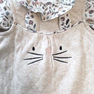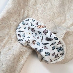 ▪️Details: Bunny rabbit with whiskers embroidered; Fleece or felt like texture tail on back; Fall leaf print throughout shirt, hat lining, bottom of feet, bunny ear details, and piping; Hat is lined; Rhombus shaped quilting; Collared long sleeve blouse