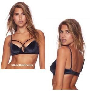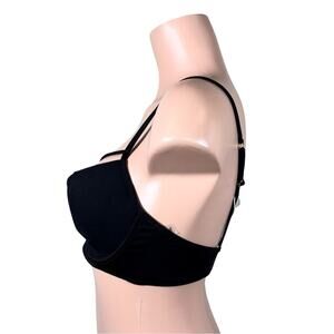 Beach Bunny Swimwear Dylan underwire bikini top in black, a solid black balconet top with demi-like structure and light padding and strappy details at. chest. Front cutout created by the criss cross strappy design. A classic underwire bikini top that is so simple it can pair with any black bottoms.