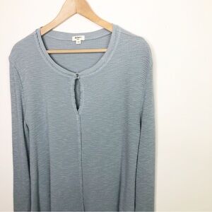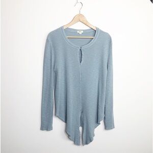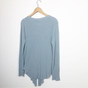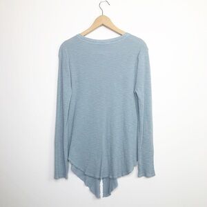 Dylan Blue waffle knit, Furman long sleeve top with keyhole button front and frayed hem and seams, with tie front and uneven hem.
