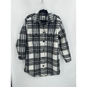 Keywords: Plaid, shacket, coat, jacket, button-front, pockets, cozy, mid-length, black, white, Dylan coat