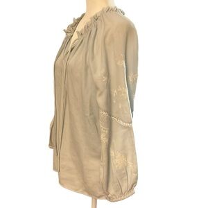 Dylan Isabel Light Blue Embroidered Woman’s Blouse Size Small. Chic Boho; Featuring long sleeve with elastic cuff, embroidered sleeve, elastic neck-line with tie. 100% Cotton