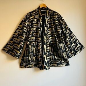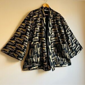 Vintage look. Robe / kimono style. Mini length. Oversized front patch pockets. Matching belt can be tied inside or outside the robe and cinched at the front or back. Bell sleeves - with inner snap closures at the hem to create a smaller opening. White embroidery at back. Fully lined, no sheerness. Midweight, non-stretch, custom embroidered jacquard fabric. Dry clean only.