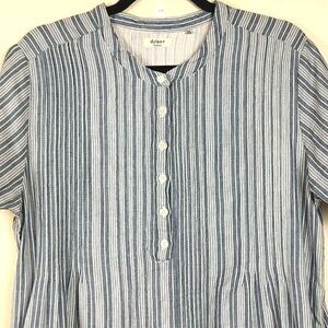 Dylan Plaza Dress in Blue and White Stripes. Fresh feminine dress with pintucking, pleating, rolled cuff sleeves, 2 on seam pockets, and a button placket. Nice weighted 100% cotton. Size Medium.