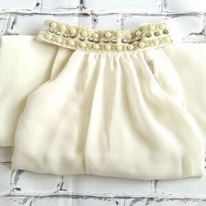 This is a white Dylan & Rose blouse for women with a cold shoulder sleeve style and a collared neckline. It features a button closure and accents, making it suitable for party or cocktail occasions. The blouse is in size M, has a regular fit, and is designed for the summer and spring seasons. It is a lightweight, solid top with a sleeveless design.