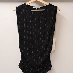 This sleeveless black top by Dylan Ryan offers an elegant touch with its metallic dotted design. New and Designed in the USA, it provides a flattering silhouette and versatile style suitable for both casual and refined settings. The lightweight material ensures comfort while maintaining a sophisticated appearance. Gathered sides.