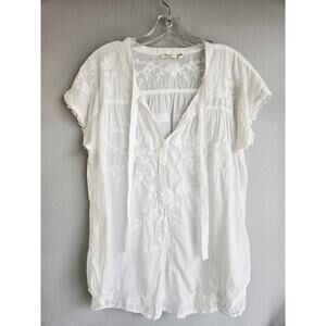 Beautiful and airy white peasant-style blouse by Dylan, perfect for a bohemian or casual summer look. The top is crafted from soft, breathable 100% cotton. ​Key Features: ​Intricate Embroidery: Features detailed white-on-white floral and vine embroidery across the front yoke, sleeves, and placket. ​Split Neckline: V-neck with a single button closure and attached ties that can be worn open or tied for a bow detail. ​Short Sleeves: Finished with a delicate trim detail (looks like small fringe/tassels). ​Relaxed Fit: A comfortable, slightly oversized fit, ideal for layering or warm weather. ​Details: ​Brand: Dylan ​Size: Women's XS ​Color: White ​Material: 100% Cotton ​Origin: Made in India ​Approximate Flat Lay Measurements (Please compare to your favorite garment): ​Pit-to-Pit (Chest): 23 inches ​Collar to Hem (Length): 27 in