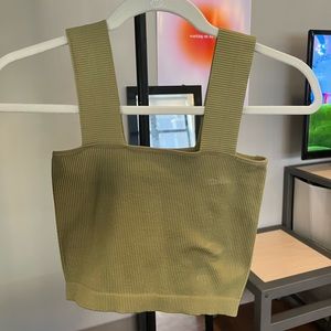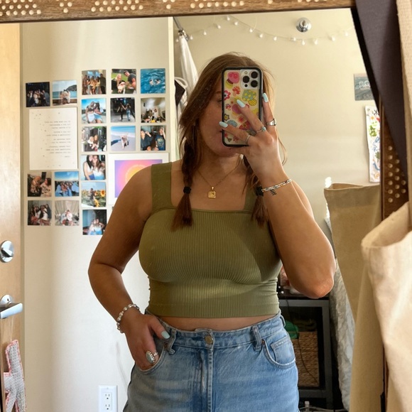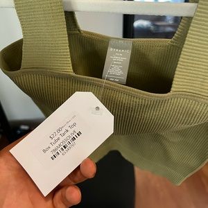 NEW WITH TAGS! Beautiful miss/olive green tube tank top with wide band straps. Super flattering and tight. Very comfortable. The last picture is a photo of me wearing the same style and size in white! “One size” sizing but could fit many body types, for reference I am usually a size 8-10-12 in tops or a size large, and cup size 36c.