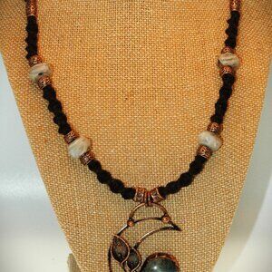 Dynamic Copper-Toned Moonstone & Leafs Crescent Moon on a Handmade Black Chain