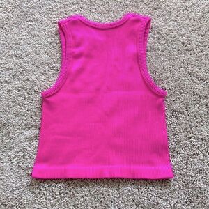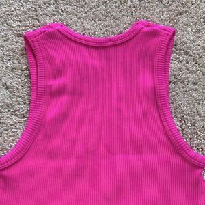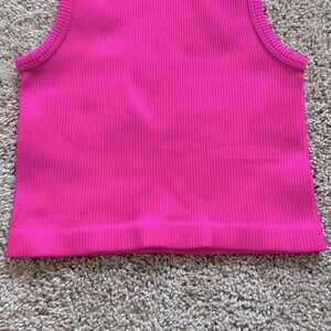 One size fits all but tagged size small. High neck. Ribbed seamless material. Super stretchy. Cropped length. Hot pink color.