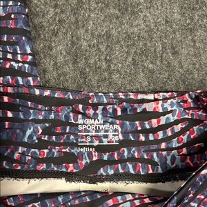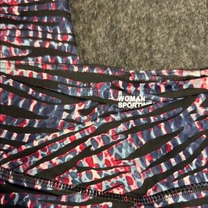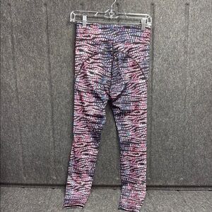 These leggings showcase a vibrant pink and blue pattern, crafted from a stretchy, performance fabric for optimal comfort. Designed to be form-fitting, they extend to the ankles, making them perfect for both exercise and casual outings.