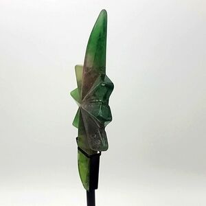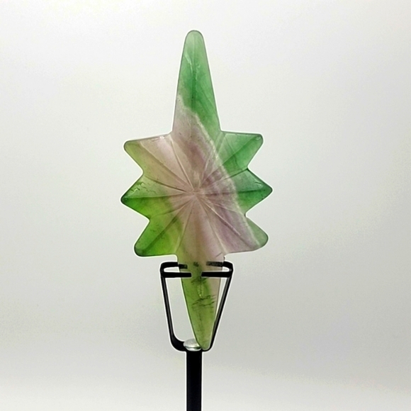Add a touch of elegance to your home with this multicolor fluorite starburst gemstone art piece. Featuring beautiful shades of green and pink, this piece is perfect for any decor. Gemstone measures 6" X 2-3/4". Comes with a black stand to display. Piece does have a flea bite on the right side, as pointed out in photos. Other marks are within the natural stone.