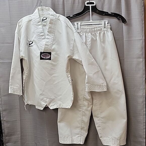 2 great Tae Kwon Do outfits. Can be used for Halloween costumes also. They are children's sz small. Both are in good shape. The white Dynamics has a few stains from storage.