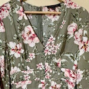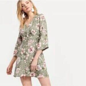 Dynamite floral sage dress with fabric mock button v-neck, size medium. Please see manufacturer size chart. In very good condition, laundered and ready to wear.