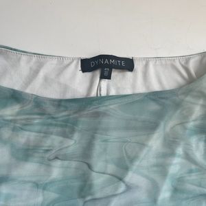Dynamite Ruched Slinky mini dress. Ruching down the sides and straight down the back for a sexy fitted yet comfortable look. Lined body with sheer sleeves. The pattern is on a mesh overlay. Swirly pale green and cream. Size Small.