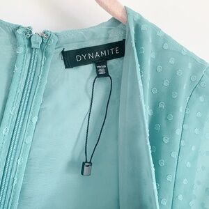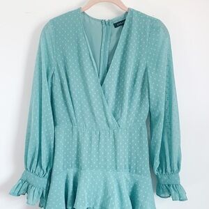 New without tags! Dynamite Sage Dot Print Mini Dress. Size XXS but runs bigger. Would fit an XS to Small best in my opinion. Fully lined except for sheer sleeves. Button and Ruffle details at cuffs. No stretch. Perfect for your your Spring or Summer event, brunch or date night! Showing more of a blue in the photos, but it’s a gorgeous green color.
