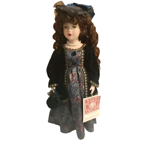 My dress fits the Victorian era and comes complete with a pearl necklace. My hair is dark and wavy. A true collector piece from the dynasty collection complete with a tag. Grab me quick all my friends are going fast. I am priced for quick sale as my present owner doesn't have the room to display and keep us. We are packed away in boxes where our true beauty escapes a collector's eye.