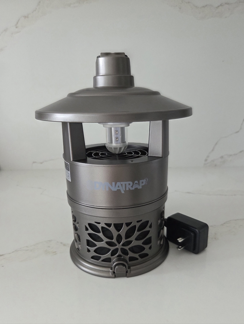 Portable mosquito and insect trap in silver/gray shade. Quiet operation with built-in LED light and fan to attract pests. Easy to set up and plug in for continuous indoor/outdoor protection. Compact design for convenient placement and targeted pest control. Works up to a half acre.