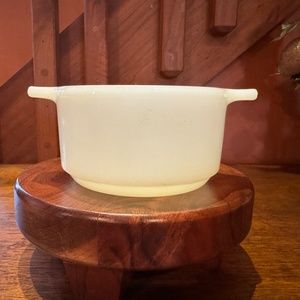 This vintage milk glass casserole dish from Dynaware features a beautiful periwinkle flower pattern on a glossy white finish. The 4 1/2 inch round dish is perfect for serving your favorite soup or dessert. The production style is fused glass and it is machine washable for easy care. This mid-century modern piece is a great addition to any collection of decorative cookware, dinnerware, and serveware. This original vintage item was made in the United States in the 1940s, 1950s, or 1960s and is in excellent condition.