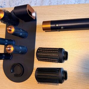 Amazing Dyson Airwrap multi-styler. Has the main styling wand. Comes with 4 curling barrels, firm smoothing brush, soft smoothing brush, and round volumizing brush. Includes the dark blue storage case and attachment mat. All attachments are there.