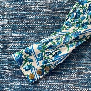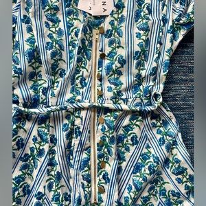 NWT Dyvna collection blue floral dress, maxi length. Beautiful details, from shirring at the shoulder, brass buttons with a hidden zipper, tie at waist, and pockets. Skirt is fully lined, but top is slightly sheer. One default which it tie loop at waist on one side came loose. See pic. This collection was featured at Nordstrom, and is known for their custom patterns. Very special and delicate. Hard to find. 100% cotton. Dry clean.